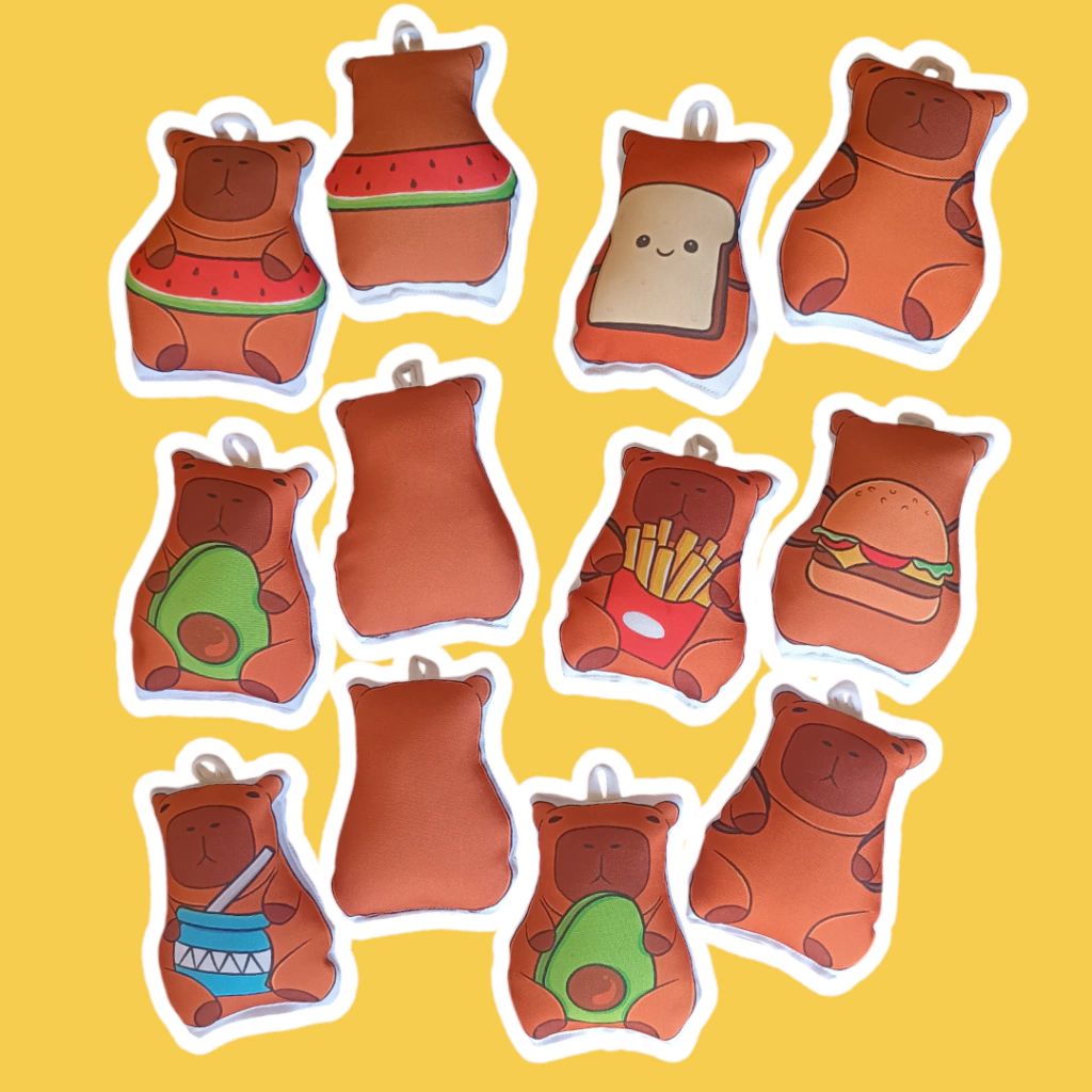 Peluchitos de 10cm con diseño en ambas caras y rellenos de vellón.