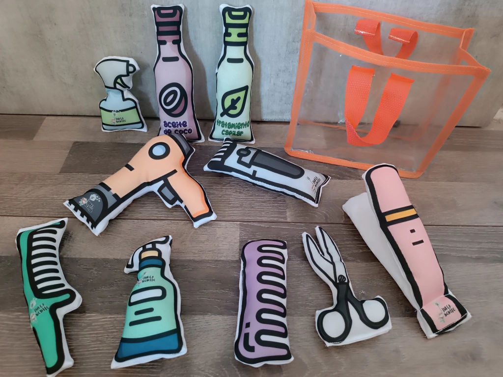 ¡Descubre el Kit de Peluquería de diseño exclusivo para jugar! Este encantador conjunto incluye 10 piezas de juguetes de tela, rellenos de vellón, que son lavables y duraderos.